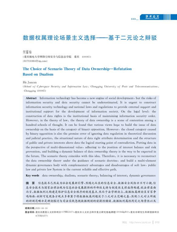 摘要信息技术已然成为社会发展新引李,然随之而至的信息安全。数据安全风险亦不可小觑信息安全技术与国家法律法规为信息社会发展提供的外部性生持与制度性支撑亟特构建.就法律层面而言,数据权利之构建是雄护信息安全秩序的制度基点然而于法学理论上,数据权属理论呈百家争鸣场面,剖析可发现各方观点多希冀于将数据权属问题筑于二元对立范畴之基,然则二元对主所致的封闭范畴亦是理论探讨与司法实践忽视数据规制的前提性错误.数据权利属性判定之场景性以及数据之上公私利益結构性矛盾的理辑起点将数据置于多雏价值视阔下,坚持利益平衡与凤险防范之主场,构建动态平衡的数据权属理论是未来可期之路场景理论与此思路不谋而合,因而,以场景主义为指导重构数据权属理论,搭建软法.公法与私法相互配合,互朴优缺的多元动态治理体系是当前可靠而有效的路径。