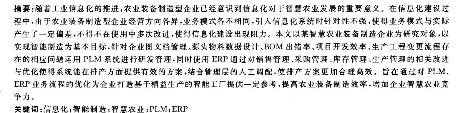 随着工业信息化的推进,农业装备制造型企业已经意识到信息化对于智慧农业发展的重要意义。在信息化建设过 程中,由于农业装备制造型企业经营方向各异,业务模式各不相同,引入信息化系统时针对性不强,使得业务模式与实际 产生了一定偏差,不得不在使用中多次改进,使得信息化建设出现阻力。本文以某智慧农业装备制造企业为研究对象,以 实现智能制造为基本目标,针对企业图文档管理、源头物料数据设计、BOM出错率、项目开发效率、生产工程变更流程存 在的相应问题运用PLM系统进行研发管理,同时使用ERP通过对销售管理、采购管理、库存管理、生产管理的相关改进 与优化使得系统能在排产方面提供有效的方案,结合管理层的人工调配,使排产方案更加合理高效。旨在通过对PLM、 ERP业务流程的优化为企业打造基于精益生产的智能工厂提供一定参考,提高农业装备制造效率,增加企业智慧农业竞 争力。