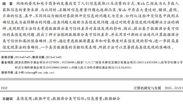 网络的普及和电子商务的发展改变了人们信息获取以及消费的方式 .Web 已经成为大多数人 获取信息的重要来源 .与此同时 ,互联网信息质量问题也逐渐凸显 .Web 中存在大量过时 、错误 、虚假 、 片面的信息 .其中 ,不同网站为相同对象提供冲突信息的问题尤为突出 .如何从这些冲突信息中找到正 确信息成为亟待解决的问题 ,这类问题又被称为真值发现问题 .通过对现有真值发现问题解决方法的调 研 ,发现现有方法均未考虑数据源分类可信性差异对真值发现的影响 .因此 ,提出基于数据源分类可信 性的真值发现问题 .提出 2 种方法探测数据源分类可信性差异 ,并采用贝叶斯的方法迭代计算数据源分 类可信性和属性值准确性 .另外 ,通过考虑数据源覆盖率和对象难度对真值发现的影响 ,进一步提高真 值发现算法的准确性 .一个真实数据集的实验结果表明 ,所提方法可以显著提高真值发现的准确性 .