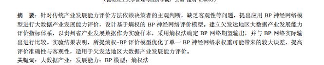 针对传统产业发展能力评价方法依赖决策者的主观判断,缺乏客观性等问题,提出应用 BP 神经网络模 型进行大数据产业发展能力评价,设计基于熵权的 BP 神经网络评价模型。建立欠发达地区大数据产业发展能力 评价指标体系,以贵州省产业发展数据作为实验样本,采用熵权法确定 BP 网络期望输出,并与 BP 网络实际输 出进行比较。实验结果表明,所提熵权-BP 评价模型优化了单一 BP 神经网络求权重可能带来的较大误差,提高 评价准确性与客观性,适用于欠发达地区大数据产业发展能力评价。