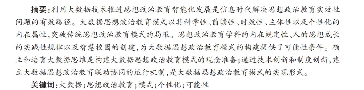 利用大数据技术推进思想政治教育智能化发展是信息时代解决思想政治教育实效性 问题的有效路径。大数据思想政治教育模式以其科学性、前瞻性、时效性、主体性以及个性化的 内在属性,突破传统思想政治教育模式的局限。思想政治教育学科的内在规定性、人的思想成长 的实践性规律以及智慧校园的创建,为大数据思想政治教育模式的构建提供了可能性条件。确 立和培育大数据思维是构建大数据思想政治教育模式的观念准备;通过技术创新和制度创新,建 立大数据思想政治教育联动协同的运行机制,是大数据思想政治教育模式的实现形式。