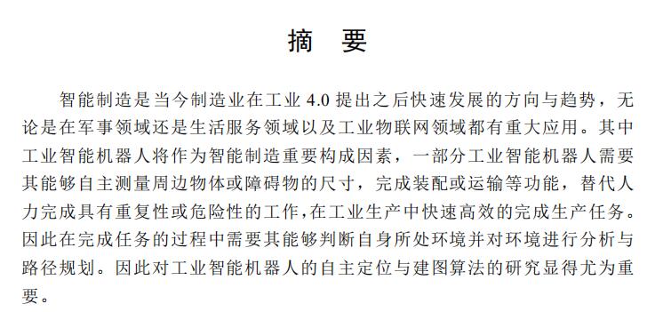 智能制造是当今制造业在工业 4.0 提出之后快速发展的方向与趋势,无 论是在军事领域还是生活服务领域以及工业物联网领域都有重大应用。其中 工业智能机器人将作为智能制造重要构成因素,一部分工业智能机器人需要 其能够自主测量周边物体或障碍物的尺寸,完成装配或运输等功能,替代人 力完成具有重复性或危险性的工作,在工业生产中快速高效的完成生产任务。 因此在完成任务的过程中需要其能够判断自身所处环境并对环境进行分析与 路径规划。因此对工业智能机器人的自主定位与建图算法的研究显得尤为重 要。