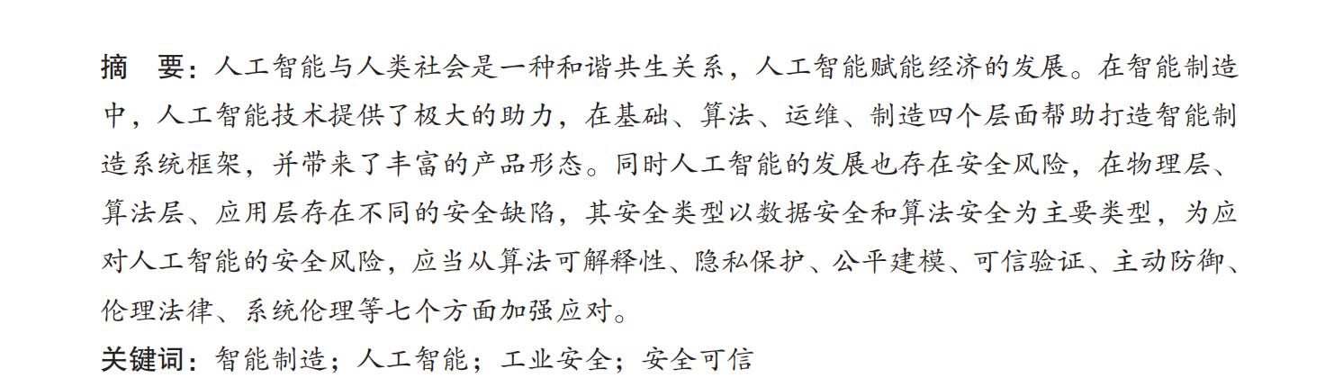 人工智能与人类社会是一种和谐共生关系,人工智能赋能经济的发展。在智能制造 中,人工智能技术提供了极大的助力,在基础、算法、运维、制造四个层面帮助打造智能制 造系统框架,并带来了丰富的产品形态。同时人工智能的发展也存在安全风险,在物理层、 算法层、应用层存在不同的安全缺陷,其安全类型以数据安全和算法安全为主要类型,为应 对人工智能的安全风险,应当从算法可解释性、隐私保护、公平建模、可信验证、主动防御、 伦理法律、系统伦理等七个方面加强应对。