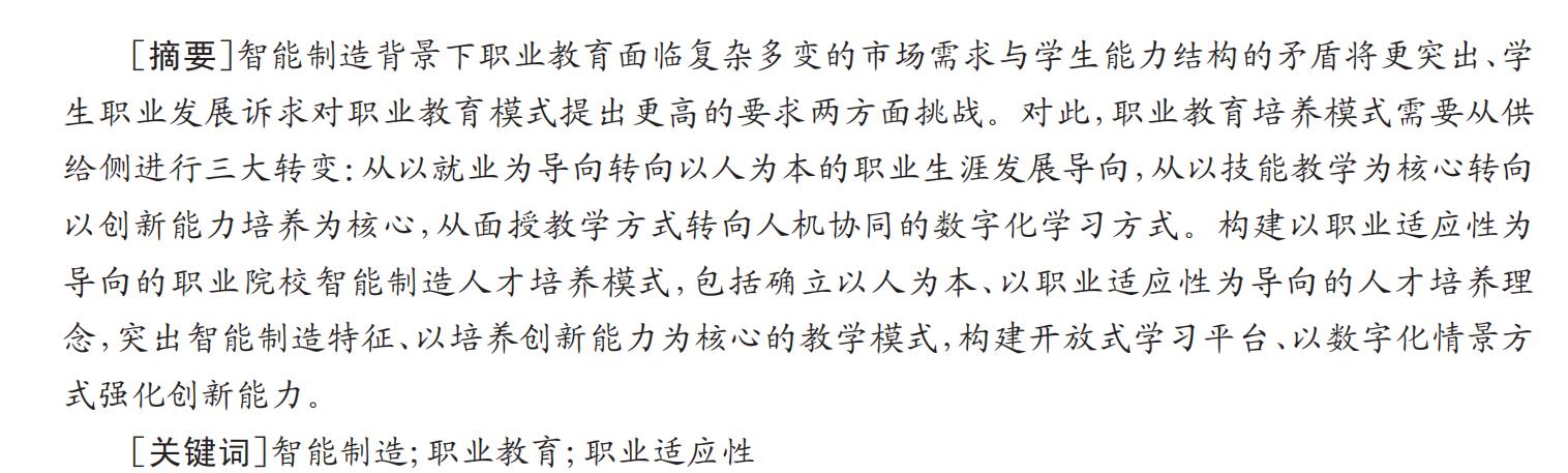 智能制造背景下职业教育面临复杂多变的市场需求与学生能力结构的矛盾将更突出、学 生职业发展诉求对职业教育模式提出更高的要求两方面挑战。对此,职业教育培养模式需要从供 给侧进行三大转变:从以就业为导向转向以人为本的职业生涯发展导向,从以技能教学为核心转向 以创新能力培养为核心,从面授教学方式转向人机协同的数字化学习方式。构建以职业适应性为 导向的职业院校智能制造人才培养模式,包括确立以人为本、以职业适应性为导向的人才培养理 念,突出智能制造特征、以培养创新能力为核心的教学模式,构建开放式学习平台、以数字化情景方 式强化创新能力。
