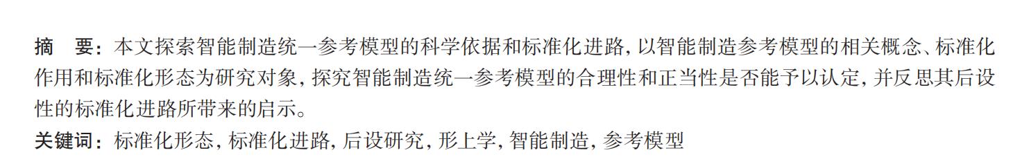 本文探索智能制造统一参考模型的科学依据和标准化进路,以智能制造参考模型的相关概念、标准化 作用和标准化形态为研究对象,探究智能制造统一参考模型的合理性和正当性是否能予以认定,并反思其后设 性的标准化进路所带来的启示。