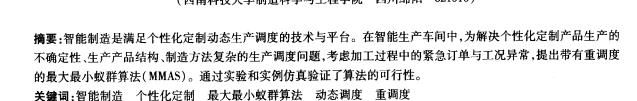 智能制造是满足个性化定制动态生产调度的技术与平台。在智能生产车间中,为解决个性化定制产品生产的 不确定性、生产产品结构、制造方法复杂的生产调度问题,考虑加工过程中的紧急订单与工况异常,提出带有重调度 的最大最小蚁群算法(MMAS)。通过实验和实例仿真验证了算法的可行性。