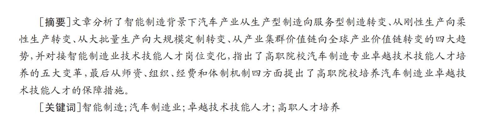 文章分析了智能制造背景下汽车产业从生产型制造向服务型制造转变、从刚性生产向柔 性生产转变、从大批量生产向大规模定制转变、从产业集群价值链向全球产业价值链转变的四大趋 势,并对接智能制造业技术技能人才岗位变化,指出了高职院校汽车制造专业卓越技术技能人才培 养的五大变革,最后从师资、组织、经费和体制机制四方面提出了高职院校培养汽车制造业卓越技 术技能人才的保障措施。