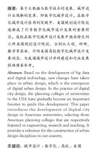 基于大数据与数字技术的发展,城市设 计出现新的变革,即数字化城市设计。在数字 化城市设计应用的实践中,美国规划设计院校 逐渐成了引导数字化城市设计发展的重要前 沿。选取在数字化城市设计发展中独居特色的 三所美国规划设计院校,分别从工程、科研、 教学等层面,介绍美国高校数字化城市设计发 展动态,为我国城市设计学科建设和行业发展 提供借鉴参考。