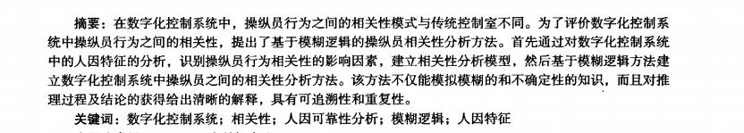 在数字化控制系统中,操纵员行为之间的相关性模式与传统控制室不同。为了评价数字化控制系 统中操纵员行为之间的相关性,提出了基于模糊逻辑的操纵员相关性分析方法。首先通过对数字化控制系统 中的人因特征的分析,识别操纵员行为相关性的影响因素,建立相关性分析模型,然后基于模糊逻辑方法建 立数字化控制系统中操纵员之间的相关性分析方法。该方法不仅能模拟模糊的和不确定性的知识,而且对推 理过程及结论的获得给出清晰的解释,具有可追溯性和重复性。