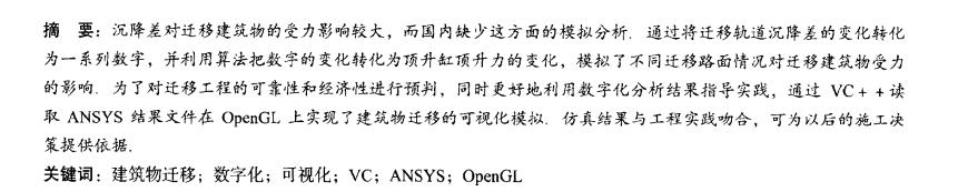 降差对迁移建筑物的受力影响较大,而国内缺少这方面的模拟分析.通过将迁移轨道沉降差的变化转化 为一系列数字,并利用算法把数字的变化转化为顶升缸顶升力的变化,模拟了不同迁移路面情况对迁移建筑物受力 的影响,为了对迁移工程的可靠性和经济性进行预判,同时更好地利用数字化分析结果指导实践,通过vc++读 取ANsYs结果文件在0penGL上实现了建筑物迁移的可视化模拟仿真结果与工程实践吻合,可为以后的施工决 策提供依据.