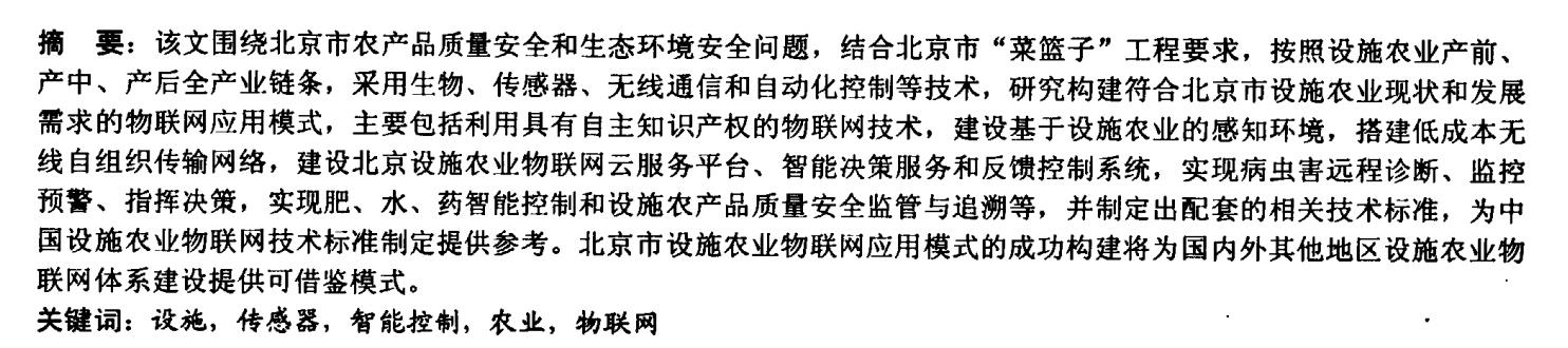文围绕北京市农产品质量安全和生态环境安全问题,结合北京市“菜篮子”工程要求,按照设施农业产前、 产中、产后全产业链条,采用生物、传感器、无线通信和自动化控制等技术,研究构建符合北京市设施农业现状和发展 需求的物联网应用模式,主要包括利用具有自主知识产权的物联网技术,建设基于设施农业的感知环境,搭建低成本无 线自组织传输网络,建设北京设施农业物联网云服务平台、智能决策服务和反馈控制系统,实现病虫害远程诊断、监控 预警、指挥决策,实现肥、水、药智能控制和设施农产品质量安全监管与追溯等,并制定出配套的相关技术标准,为中 国设施农业物联网技术标准制定提供参考。北京市设施农业物联网应用模式的成功构建将为国内外其他地区设施农业物 联网体系建设提供可借鉴模式。
