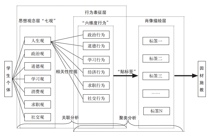 大数据时代为高校学生思想进行“数据肖像”的精准 描绘,具有丰富的内涵与重要意义。行为与思想具有高度相 关性,这是绘制“数据肖像”的逻辑前提;将思想与行为通过 大数据科学联结,在调研并建立高校学生思想的“七观”刻 画标准、搭建学生“六维”行为大数据平台的基础上,构建高 校学生数据肖像层次结构模型,可以实现为学生思想特征的 “画像”。为高校学生思想进行数据肖像精准描绘是一个系 统工程,需要教育行政主管部门的保障与规范、高校管理层 面的支持与引导、思想政治教育队伍的改变与适应以及高校 学生的配合与参与。