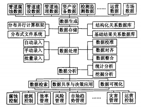 以往管道企业数据分析侧重于因果关系,而在大数据时代,管道系统一系列的信息集成、管理 程序、检测记录以及日常运维记录等都将通过物联网、云计算等数据网络串联起来,其数据分析方向 逐渐由因果关系向非因果(关联性)关系转变。通过对大数据分析模型进行研究,得出大数据分析 将是管道企业未来发展的重要趋势之一,建立了适合于未来发展的管道系统大数据管理架构模型, 提出了基于大数据的管道数据算法模型,进一步完善了内检测数据管理模型,并在管道泄漏和预警、 管道地质灾害、管道腐蚀管理、管道内检测数据分析等方面实践应用,获得了能耗控制、灾害管理、风 险控制等综合性、全局性的分析结论,对于管道大数据领域在管道行业的发展和应用具有重要意义。