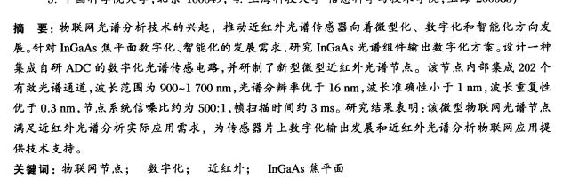 物联网光谱分析技术的兴起,推动近红外光谱传感器向着微型化、数字化和智能化方向发 展。针对InGaAs焦平面数字化、智能化的发展需求,研究InGaAs光谱组件输出数字化方案。设计一种 集成自研ADC的数字化光谱传感电路,并研制了新型微型近红外光谱节点。该节点内部集成202个 有效光谱通道,波长范围为900~l 700IlIIl,光谱分辨率优于16IlIIl,波长准确性小于l m,波长重复性 优于o.3 m,节点系统信噪比约为500:l,帧扫描时间约3 ms。研究结果表明:该微型物联网光谱节点 满足近红外光谱分析实际应用需求,为传感器片上数字化输出发展和近红外光谱分析物联网应用提 供技术支持