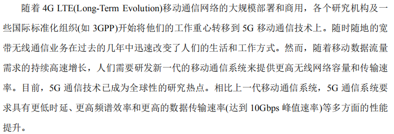 随着 4G LTE(Long-Term Evolution)移动通信网络的大规模部署和商用,各个研究机构及一 些国际标准化组织(如 3GPP)开始将他们的工作重心转移到 5G 移动通信技术上。随时随地的宽 带无线通信业务在过去的几年中迅速改变了人们的生活和工作方式。然而,随着移动数据流量 需求的持续高速增长,人们需要研发新一代的移动通信系统来提供更高无线网络容量和传输速 率。目前,5G 通信技术已成为全球性的研究热点。相比上一代移动通信系统,5G 通信系统要 求具有更低时延、更高频谱效率和更高的数据传输速率(达到 10Gbps 峰值速率)等多方面的性能 提升。