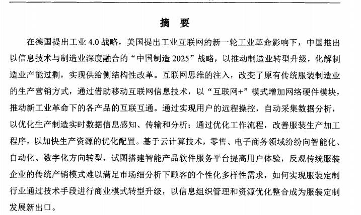 在德国提出工业4.0战略,美国提出工业互联网的新一轮工业革命影响下,中国推出以信息技术与制造业深度融合的“中国制造2025”战略,以推动制造业转型升级,化解制造业产能过剩,实现供给侧结构性改革。互联网思维的注入,改变了原有传统服装制造业的生产营销方式,通过借助移动互联网信息技术,以“互联网+”模式增加网络硬件模块,推动新工业革命下的各产品的互联互通。通过实现用户的远程操控,自动采集数据分析,以优化生产制造实时数据信息感知、传输和分析;通过优化工作流程,改善服装生产加工程序,以加快生产资源的优化配置。基于云计算技术,零售、电子商务领域纷纷向智能化、自动化、数字化方向转型,试图搭建智能产品软件服务平台提高用户体验,反观传统服装企业的传统产销模式难以满足市场细分析下顾客的个性化多样性需求,如何实现服装定制行业通过技术手段进行商业模式转型升级,以信息组织管理和资源优化整合成为服装定制发展新出口。