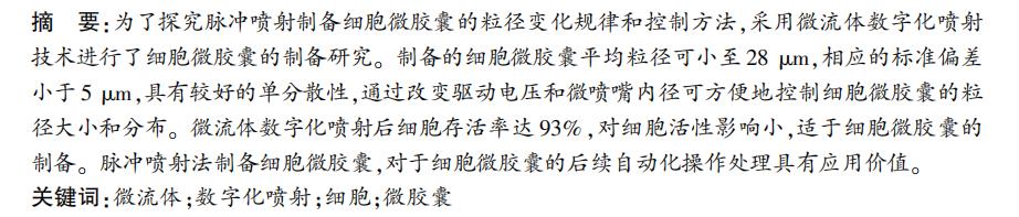 为了探究脉冲喷射制备细胞微胶囊的粒径变化规律和控制方法,采用微流体数字化喷射 技术进行了细胞微胶囊的制备研究。 制备的细胞微胶囊平均粒径可小至 28 滋m,相应的标准偏差 小于 5 滋m,具有较好的单分散性,通过改变驱动电压和微喷嘴内径可方便地控制细胞微胶囊的粒 径大小和分布。 微流体数字化喷射后细胞存活率达 93% ,对细胞活性影响小,适于细胞微胶囊的 制备。 脉冲喷射法制备细胞微胶囊,对于细胞微胶囊的后续自动化操作处理具有应用价值。