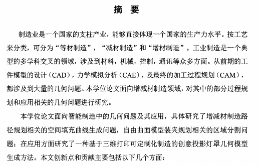 制造业是一个国家的支柱产业,能够直接体现一个国家的生产力水平。按工艺 来分类,可分为“等材制造”,“减材制造”和“增材制造”。工业制造是一个典 型的多学科交叉的领域,涉及到材料,机械,控制,通讯等众多方面。从前期的工 件模型的设计(cAD),力学模拟分析(CAE),及最终的加工过程规划(cAM), 都涉及到大量的几何问题。本学位论文面向增减材制造领域,对其中的部分过程规 划和应用相关的几何问题进行研究。