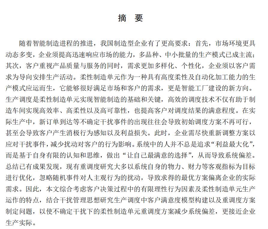 随着智能制造进程的推进,我国制造型企业有了更高要求:首先,市场环境更具动态多变,企业须提高迅速响应市场的能力,多品种、中小批量的生产模式已成主流;其次,客户重视产品质量与服务的同时,需求更加多样化、个性化,企业须以客户需求为导向安排生产活动。柔性制造单元作为一种具有高度柔性及自动化加工能力的生产模式应运而生,它能够很好满足市场和客户的需求,更是智能工厂建设的新方向。生产调度是柔性制造单元实现智能制造的基础和关键,高效的调度技术不仅有助于制造车间实现高效率、高柔性以及高可靠性,也提高客户对调度结果的满意程度。在实际生产中,新订单到达等不确定干扰事件的出现往往会导致初始调度方案不再可行,甚至会导致客户产生消极行为感知以及利益损失。此时,企业需尽快重新调整方案以应对干扰事件,减少扰动对客户的行为影响。系统中的人并不总是追求“利益最大化”,而是基于自身有限的认知和思维,做出“让自己最满意的选择”,从而导致系统偏差。总结已有成果发现,现有重调度研究大多以系统自身的物力、财力等客观指标为目标进行优化,忽略随机事件对人主观行为的扰动,导致求得的最优方案偏离企业的实际需求。因此,本文综合考虑客户决策过程中的有限理性行为因素及柔性制造单元生产运作的特点,结合干扰管理思想研究生产调度中客户满意度模型构建以及重调度方案制定问题,以使不确定干扰下的柔性制造单元重调度方案减少系统偏差,更接近企业生产实际。