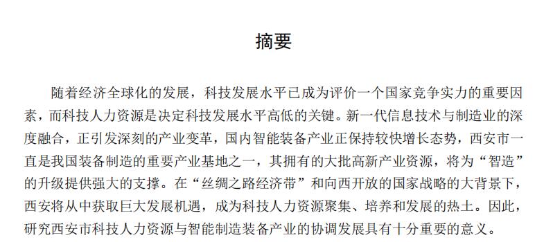 随着经济全球化的发展,科技发展水平已成为评价一个国家竞争实力的重要因 素,而科技人力资源是决定科技发展水平高低的关键。新一代信息技术与制造业的深 度融合,正引发深刻的产业变革,国内智能装备产业正保持较快增长态势,西安市一 直是我国装备制造的重要产业基地之一,其拥有的大批高新产业资源,将为“智造” 的升级提供强大的支撑。在“丝绸之路经济带”和向西开放的国家战略的大背景下, 西安将从中获取巨大发展机遇,成为科技人力资源聚集、培养和发展的热土。因此, 研究西安市科技人力资源与智能制造装备产业的协调发展具有十分重要的意义。