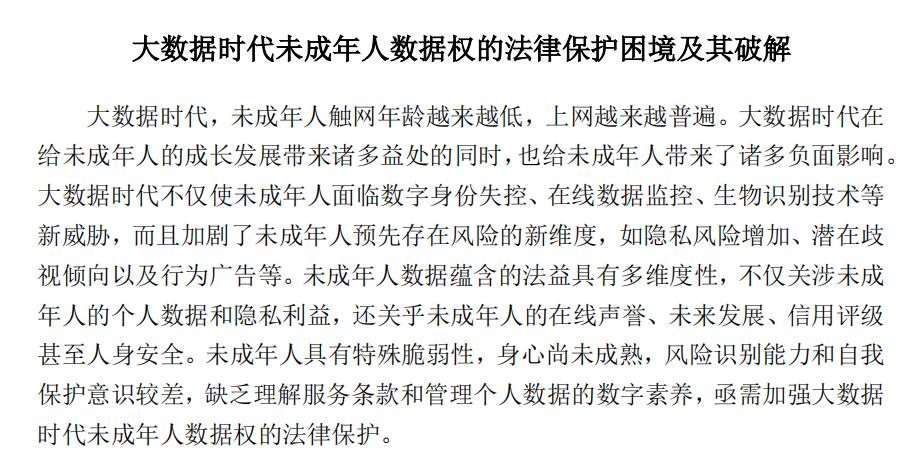 大数据时代,未成年人触网年龄越来越低,上网越来越普遍。大数据时代在给未成年人的成长发展带来诸多益处的同时,也给未成年人带来了诸多负面影响。大数据时代不仅使未成年人面临数字身份失控、在线数据监控、生物识别技术等新威胁,而且加剧了未成年人预先存在风险的新维度,如隐私风险增加、潜在歧视倾向以及行为广告等。未成年人数据蕴含的法益具有多维度性,不仅关涉未成年人的个人数据和隐私利益,还关乎未成年人的在线声誉、未来发展、信用评级甚至人身安全。未成年人具有特殊脆弱性,身心尚未成熟,风险识别能力和自我保护意识较差,缺乏理解服务条款和管理个人数据的数字素养,亟需加强大数据时代未成年人数据权的法律保护。