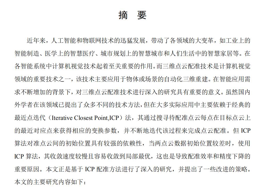 近年来,人工智能和物联网技术的迅猛发展,带动了各领域的大变革,如工业上的 智能制造、医学上的智慧医疗、城市规划上的智慧城市和人们生活中的智慧家居等。在 各智能系统中计算机视觉技术起着至关重要的作用。而三维点云配准技术是计算机视觉 领域的重要技术之一,该技术主要应用于物体或场景的自动化三维重建。在智能应用需 求不断增加的背景下,对三维点云配准技术进行深入的研究具有重要的意义。虽然国内 外学者在该领域已提出了众多不同的技术方法,但在大多实际应用中主要依赖于经典的 最近点迭代(Iterative Closest Point,ICP)法,其通过搜寻待配准点云每点在目标点云上 的最近对应点来获得相应的变换参数,并不断地迭代该过程来完成点云配准。但 ICP 算法对准点云间的初始位置具有较强的依赖性,当两点云数据初始位置较差时,使用 ICP 算法,其收敛速度较慢且容易收敛到局部最优,这也是导致配准效率和精度下降的 重要原因。