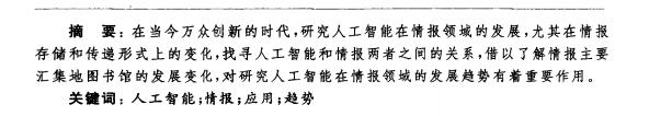 在当今万众创新的时代,研究人工智能在情报领域的发展,尤其在情报 存储和传递形式上的变化,找寻人工智能和情报两者之间的关系,借以了解情报主要 汇集地图书馆的发展变化,对研究人工智能在情报领域的发展趋势有着重要作用。