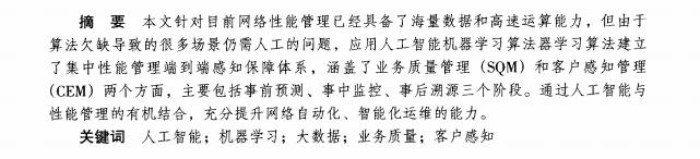 文针对目前网络性能管理已经具备了海量数据和高速运算能力,但由于 算法欠缺导致的很多场景仍需人工的问题,应用人工智能机器学习算法器学习算法建立 了集中性能管理端到端感知保障体系,涵盖了业务质量管理(SQM)和客户感知管理 (CEM)两个方面,主要包括事前预测、事中监控、事后溯源三个阶段。通过人工智能与 性能管理的有机结合,充分提升网络自动化、智能化运维的能力。