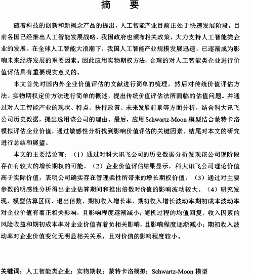 随着科技的创新和新概念产品的提出,人工智能产业目前正处于快速发展阶段。目 前各国己经推出人工智能发展战略,我国政府也颁布相关政策,大力支持人工智能类企 业的发展。在全球人工智能大浪潮下,我国人工智能产业规模发展迅速,已逐渐成为影 响未来经济发展的重要因素。因此应用实物期权方法,合理的对人工智能类企业进行价 值评估具有重要现实意义的。