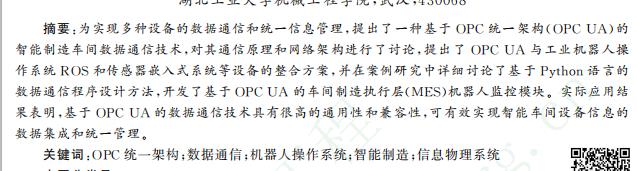 为实现多种设备的数据通信和统一信息管理,提出了一种基于 OPC 统一架构(OPC UA)的 智能制造车间数据通信技术,对其通信原理和网络架构进行了讨论,提出了 OPC UA 与工业机器人操 作系统 ROS 和传感器嵌入式系统等设备的整合方案,并在案例研究中详细讨论了基于 Python 语言的 数据通信程序设计方法,开发了基于 OPC UA 的车间制造执行层(MES)机器人监控模块.实际应用结 果表明,基于 OPC UA 的数据通信技术具有很高的通用性和兼容性,可有效实现智能车间设备信息的 数据集成和统一管理.