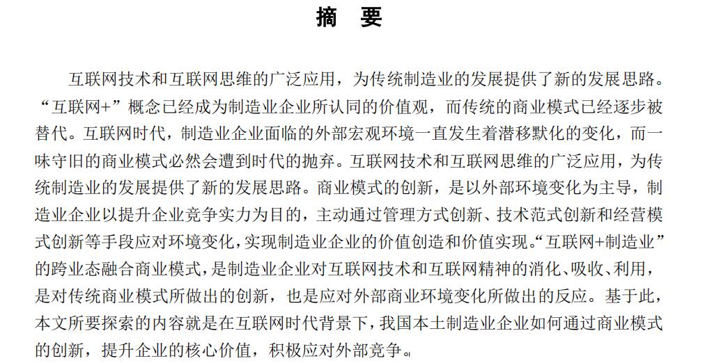互联网技术和互联网思维的广泛应用,为传统制造业的发展提供了新的发展思路。“互联网+”概念已经成为制造业企业所认同的价值观,而传统的商业模式已经逐步被替代。互联网时代,制造业企业面临的外部宏观环境一直发生着潜移默化的变化,而一味守旧的商业模式必然会遭到时代的抛弃。互联网技术和互联网思维的广泛应用,为传统制造业的发展提供了新的发展思路。商业模式的创新,是以外部环境变化为主导,制造业企业以提升企业竞争实力为目的,主动通过管理方式创新、技术范式创新和经营模式创新等手段应对环境变化,实现制造业企业的价值创造和价值实现。“互联网+制造业”的跨业态融合商业模式,是制造业企业对互联网技术和互联网精神的消化、吸收、利用,是对传统商业模式所做出的创新,也是应对外部商业环境变化所做出的反应。基于此,本文所要探索的内容就是在互联网时代背景下,我国本土制造业企业如何通过商业模式的创新,提升企业的核心价值,积极应对外部竞争。