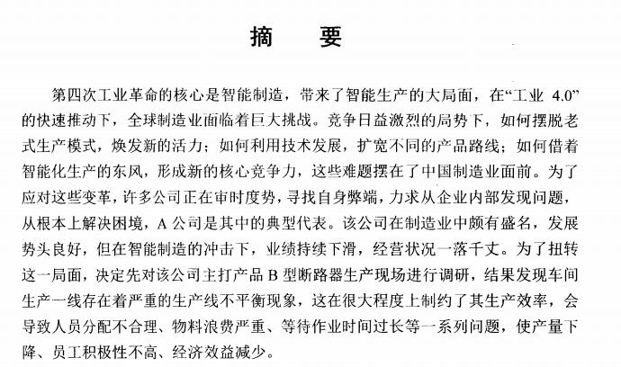 第四次工业革命的核心是智能制造,带来了智能生产的大局面,在“工业4.0”的快速推动下,全球制造业面临着巨大挑战。竞争日益激烈的局势F,如何摆脱老式生产模式,焕发新的活力;如何利用技术发展,扩宽刁、=同的产品路线;如何借着智能化生产的东风,形成新的核心竞争力,这些难题摆在了中国制造业面前。为了应对这些变革,许多公司正在审时度势,寻找自身弊端,力求从企业内部发现问题,从根本上解决困境,A公司是其中的典型代表。该公司在制造业中颇有盛名,发展势头良好,但在智能制造的冲击下,业绩持续下滑,经营状况一落千丈。为了扭转这一局面,决定先对该公司主打产品B型断路器生产现场进行调研,结果发现车间生产一线存在着严重的生产线不平衡现象,这在很大程度上制约了其生产效率,会导致人员分配不合理、物料浪费严重、等待作业时间过长等一系列问题,使产量下降、员工积极性不高、经济效益减少。