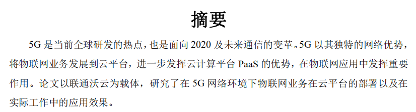 5G 是当前全球研发的热点,也是面向 2020 及未来通信的变革。5G 以其独特的网络优势, 将物联网业务发展到云平台,进一步发挥云计算平台 PaaS 的优势,在物联网应用中发挥重要 作用。论文以联通沃云为载体,研究了在 5G 网络环境下物联网业务在云平台的部署以及在 实际工作中的应用效果