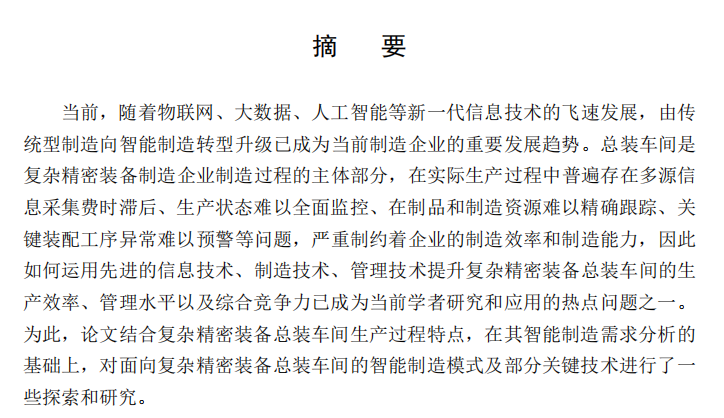 当前,随着物联网、大数据、人工智能等新一代信息技术的飞速发展,由传 统型制造向智能制造转型升级已成为当前制造企业的重要发展趋势。总装车间是 复杂精密装备制造企业制造过程的主体部分,在实际生产过程中普遍存在多源信 息采集费时滞后、生产状态难以全面监控、在制品和制造资源难以精确跟踪、关 键装配工序异常难以预警等问题,严重制约着企业的制造效率和制造能力,因此 如何运用先进的信息技术、制造技术、管理技术提升复杂精密装备总装车间的生 产效率、管理水平以及综合竞争力已成为当前学者研究和应用的热点问题之一。 为此,论文结合复杂精密装备总装车间生产过程特点,在其智能制造需求分析的 基础上,对面向复杂精密装备总装车间的智能制造模式及部分关键技术进行了一 些探索和研究。