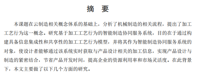本课题在云制造相关概念体系的基础上,分析了机械制造的相关流程,提出了加工 工艺行为这一概念。研究基于加工工艺行为的智能制造协同服务系统,目的在于通过构 建具备信息集成性和共享性的加工工艺行为模型,并将其作为智能制造协同服务系统的 对象,使设计者能够通过该系统实时获取与产品设计相关的加工信息,实现产品设计与 制造的紧密结合,节省产品开发时间,提高企业的资源利用率和市场灵活度。在此背景 下,本文主要做了以下几个方面的研究。