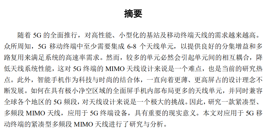 随着 5G 的全面推行,对高性能、小型化的基站及移动终端天线的需求越来越高。 众所周知,5G 移动终端中至少需要集成 6-8 个天线单元,以提供良好的分集增益和多 路复用来满足系统的高速率需求。然而,较多的单元必然会引起单元间的相互耦合,降 低天线系统性能,这对 5G 终端的 MIMO 天线设计来说是一个难点,也是当前的研究热 点。此外,智能手机作为科技与时尚的结合体,一直向着更薄、更高屏占的设计理念不 断发展。如何在具有极小净空区域的全面屏手机内部布局更多的天线单元,并同时兼容 全球各个地区的 5G 频段,对天线设计来说是一个极大的挑战。因此,研究一款紧凑型、 多频段 MIMO 天线,应用于 5G 终端设备,具有重要的现实意义。本文对应用于 5G 移 动终端的紧凑型多频段 MIMO 天线进行了研究与分析。