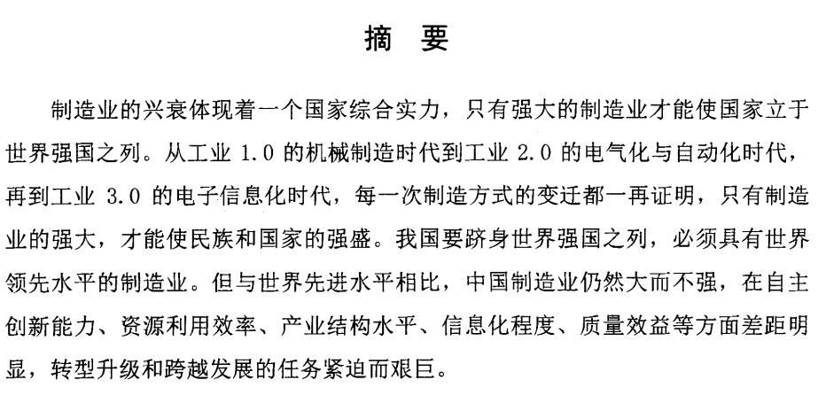 制造业的兴衰体现着一个国家综合实力,只有强大的制造业才能使国家立于世界强国之列。从工业1.0的机械制造时代到工业2.0的电气化与自动化时代,再到工业3.0的电子信息化时代,每一次制造方式的变迁都一再证明,只有制造业的强大,才能使民族和国家的强盛。我国要跻身世界强国之列,必须具有世界领先水平的制造业。但与世界先进水平相比,中国制造业仍然大而不强,在自主创新能力、资源利用效率、产业结构水平、信息化程度、质量效益等方面差距明显,转型升级和跨越发展的任务紧迫而艰巨。