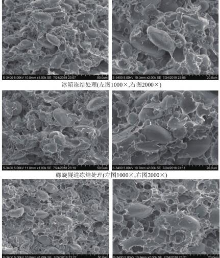 为探究液氮间歇式浸渍冻结对饺子色差、质构、感官品质和微观结构的影响,本文以冻裂率为指标分别研究液氮浸入时间、间隔时间、浸入次数对饺子的影响;以低温冰箱冻结、螺旋隧道式冻结为对比,采用色差仪、质构仪、扫描电镜等分别研究液氮间歇式浸渍冻结对饺子色泽、质构、感官特性及微观结构等品质特性的影响 结果表明,当液氮单次浸入时间为2 s,间隔时间为10 s,浸入8次,总时间为86 s时,用时最短,同时中心温度达到一18℃以下,且饺子冻裂率为零,与传统的低温冰箱冻结、隧道式冻结方式相比,液氮间歇式浸渍冻结后饺子L 8显著性提高(P<0.05),色泽外观明显改善,硬度、胶着性、咀嚼性显著降低(P<0.05),口感更接近于新鲜未处理组饺子品质。扫描电镜观察结果表明液氮冻结处理组饺子皮内部形成孔洞最小且最多,过多的孔洞可能破坏了面筋网络结构,导致饺子耐煮性较差。本研究为液氮冻结在米面制品中的应用提供了一定的理论基础和技术支撑。