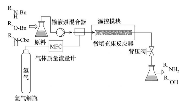 保护与脱保护是医药中间体等精细化工领域中较为常见的一种有机合成策略。常用的保护基主要有苄基与苄氧羰基,通常可利用催化加氢法将其脱除。采用高压加氢间歇釜工艺存在气液传质效率低,操作安全性差,氢解效率低等问题。采用连续微反应加氢技术进行非均相催化加氢脱保护,可以利用其较高的气液传质效率和平推流特性实现高选择性脱保护,并显著缩短反应时间。本文阐述了连续微反应加氢技术在脱保护反应中的优点及其在药物中间体合成中的实际应用,并介绍了催化剂与溶剂对脱保护反应的影响。最后对连续微反应加氢技术在脱保护中的应用进行了展望。