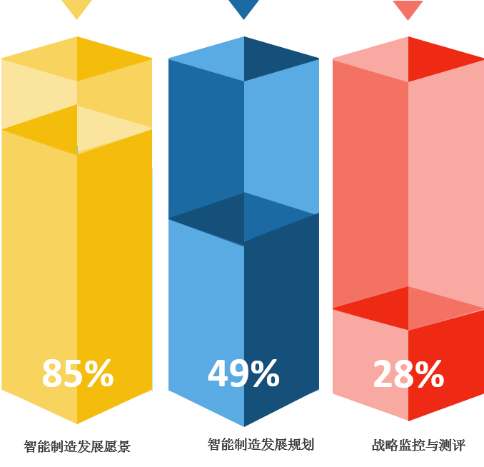 制造企业已深刻意识到智能制造是提升核心竞争力的关键,并逐步将智能制造细化到企业的战略举措中。目前已有85%的企业具备智能制造发展愿景,49%的企业制定了智能制造发展规划,28%的企业在战略执行过程中定期开展评测与监控,并根据评测结果对智能制造战略进行优化和调整。