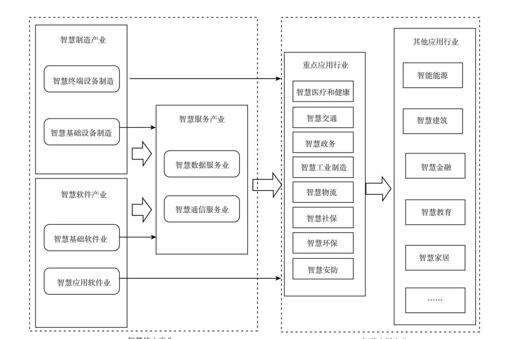 目前,关于智慧城市产业组成的观点,多是从解决城市发展问题或信息技术发展领域等角度出发,缺少比较科学、系统的分析方法,提出的产业组成内容也不够全面。为更好研究智慧产业,明确智慧产业内容,笔者尝试分三步选择智慧产业。第一步,以应用为导向,梳理政府、专家提出的智慧应用领域,结合中国城市发展面临问题,找出建设智慧城市最需要建设的若干个领域。第二步,通过深入分析,梳理重点智慧应用领域中主要运用的技术和产品。第三步,将主要运用的技术和产品划分形成不同类别,归纳形成智慧产业,并与最新的 《国民经济分类及行业代码》[( GB/T 4754—2011) ] 进行对应。