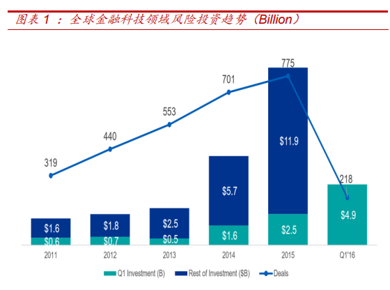 近年来,全球金融科技领域发展迅猛, 毕马威与 CB Insights 联合发布 的数据显示,2014 年以来金融科技领域呈现爆发式增长,2015 年风险 投资总额达 144 亿美金,较 2014 年增长 97%,较 2013 年增长 380%, 创历史新高。2016 年一季度涨势未减,单季度风险投资额 49 亿美金, 较去年同期增长 96%,成交 281 单,值得注意的是,其中中国陆金所和 京东金融为融资规模居首,融资规模达到 10 美金以上,占全球一季度 总风险融资规模的近一半。