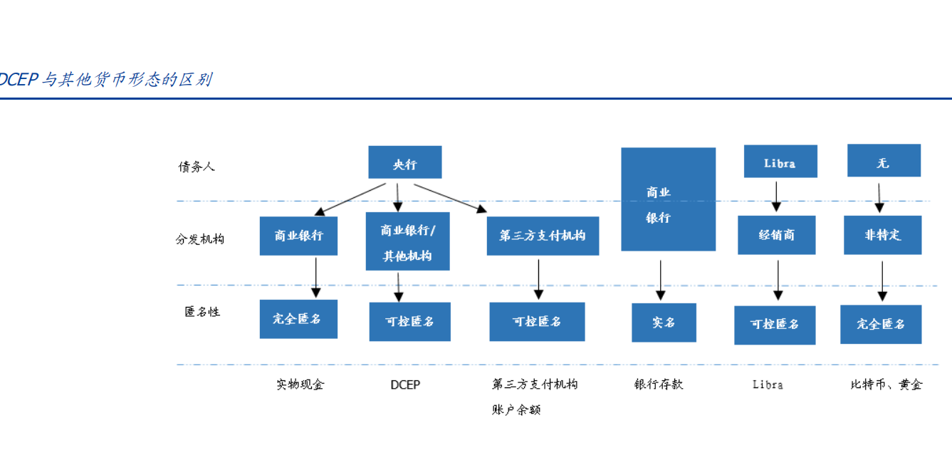 央行的数字货币是央行负债注重对现金的替代,采用“央行-商业银行、其他机构”的双层运营体系,考虑区块链技术,可控匿名(仅对央行披露交易数据),这使得它与其他数字资产区别开来。央行的数字货币仍是现金,但比实物现金便携;是央行负债,比一般银行存款安全;比第三方支付机构账户余额接受度或将更高,有利于顺应数字经济浪潮。例如,相比于银行存款,对持有人而言,数字货币是对央行的债权,更无风险;银行存款是对商业银行的债权,有风险(尽管十分微小)。