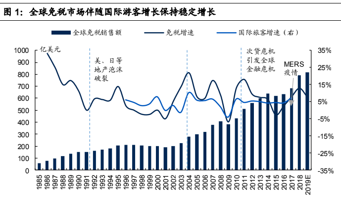 近些年来,伴随全球经济的发展以及国际游客的持续增长,全球免税市场持续 保持稳定较快的增长趋势。2000-2018 年,全球免税销售额年均复合增长率为 8.41%,近八年即 2011-2018 年年均复合增速 7.38%,其中除 2008 年全球经 济危机、2015 年 MERS 疫情影响下出现短暂波动外,全球免税总体维持良好 增长势头。2018 年全球免税市场已经达 789.6 亿美元,同比增长 12.9%。根据 Generation Research 预测,2019 年全球免税行业销售规模将达到 818.22 亿 美元,同比增长 7.8%。