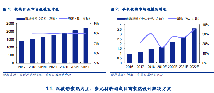 热设计和热管理是电子产品组件的核心构成,并且随着组装密度和集成度的持续提升而越来 越受到重视。散热下游应用领域众多,包括消费电子、和汽车、基站、服务器和数据中心等, 市场空间在千亿级别。根据前瞻产业研究院预估,2018 年~2023 年散热产业年复合成长率 达 8%,市场规模有望从 2018 年的 1497 亿元增长到 2023 年的 2199 亿元。