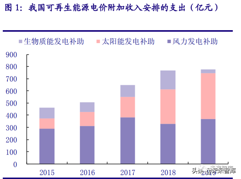 “十二五、十三五”期间补贴主要集中在风光及新能源汽车领域。(1)可再生能源:2012 年 3 月,财政部、发改委、能源局联合颁布的《可再生能源电价附加补助资金管理暂 行办法》,明确了财政部在补贴管理中的主导地位和“按季预拨、年终清算”的原则。2019 年,我国可再生能源电价附加收入安排的支出达到 778.1 亿元,其中风电为 368.52 亿元(占 比 47.4%),光伏为 374.72 亿元(占比 48.2%)。(2)新能源汽车:2009 年 1 月,财政 部发布《关于开展节能和新能源汽车示范推广试点工作的通知》,明确对试点城市公共服 务领域购置新能源汽车给予补助。2013 年至今,工信部联合其他部委先后发布多份新能源 汽车购置补贴通知文件。截至 2018 年,我国仅新能源汽车推广应用补助资金清算车辆的应 清算补助资金累计已超过 500 亿元。