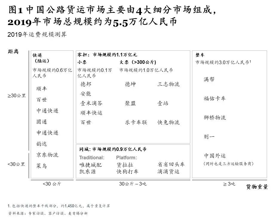 公路货运在我国有着极其重要的地位。按照国家统计局数据,2019年我国公路货运周转量接近7万5千亿吨公里,是铁路货运的2.5倍,仅次于水运,占货运总周转量的38%。对市场细分可分为快递、快运、区域零担、大票零担、整车及城配等六大板块,市场总规模约为5.5万亿元。其中整车运输规模最大,达到约3万亿元;其次为零担和同城运输,体量相当, 均为约1万亿元;剩余市场包括快递陆运部分,约为0.6万亿元。