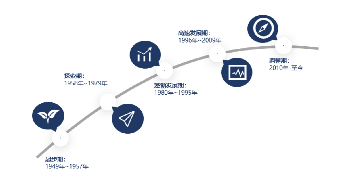 中国水泥行业始于 1949 年,经历了 40 多年发展,已由传统小型立窑的制造工艺发展为新型干法水泥生产技术,同时也实现了产品质量的提升,目前已进入行业调整期。中国水泥行业由起步到现在可大致划分为五个发展阶段: