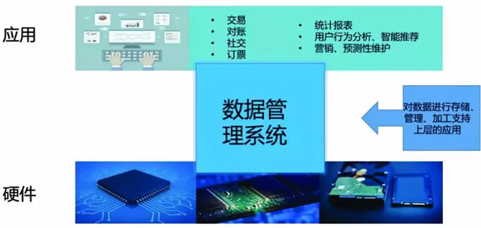 大数据的技术是数据管理技术的一种,数据管理系统有着悠久的发展历史,它是所有计算机应用的基础。谈到数据管理的软件,必须关注数据管理软件所依赖的硬件环境和它来解决的应用场景,我们可以通过图1来认识数据管理软件的位置。首先它是一种软件,处于底层硬件和上层应用之间,本质上是利用计算机硬件的存储和计算能力,对数据进行存储、管理、加工等操作,最终为了支持上层各类应用。