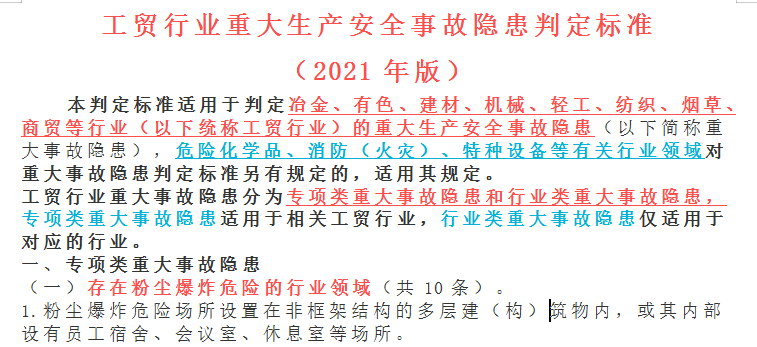 2021年版《工贸行业重大生产安全事故隐患判定标准》